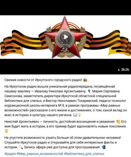 В рамках проекта «Мир равных возможностей» на городском радиоканале города Иркутска проведена 14 августа 2025 года информационная радиопередача для незрячих и слабовидящих «Свет не погас».